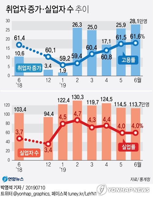 통계청이 10일 발표한 '2019년 6월 고용동향'에 따르면 지난달 취업자는 2천740만8천명으로 1년 전보다 28만1천명 늘었다.