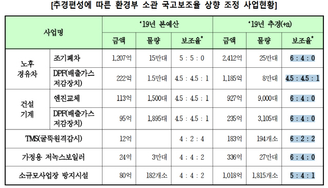 특히 미세먼지를 줄이기 위한 대기 개선 사업 중 2019년 본예산 대비 추경 증액분이 크게 늘어난 사업들의 경우에는 노후 경유차 배출가스저감장치(DPF) 부착( 본예산 222억 1,200만원→추경 1,185억 2,000만원), 노후 건설기계 엔진 교체(본예산 112억 5,000만원→추경 927억원), 소규모 사업장 방지시설 설치(본예산 80억원→1,018억 3,500만원), 가정용 저녹스(NOx;질소산화물) 보일러 보급(본예산 24억원→336억원), 굴뚝자동측정기기(TMS) 설치 지원(본예산 12억 1,900만원→183억 900만원) 등이 있다. 이들 사업의 경우 늘어난 예산에 비례해 지방비 부담규모도 크게 늘어난 상황이다.