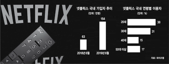 16일 앱 분석업체 와이즈앱에 따르면 올해 6월 기준 넷플릭스의 유료 가입자는 184만명에 이르는 것으로 조사됐다. 이는 1년 전(63만명)에 비해 192% 증가한 수치다. 184만명의 가입자들은 인당 월평균 1만 3,130원을 소비하는 것으로 나타났다. 이에 따라 매달 넷플릭스가 국내에서 거둬들이는 금액은 241억원에 달한다.