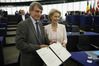 우르줄라 폰데어라이엔 독일 국방장관(오른쪽)이 16일(현지시간) 프랑스 스트라스부르에서 열린 유럽의회 본회의에서 차기 유럽연합(EU) 집행위원장으로 공식 선출된 뒤 다비드 사솔리 유럽의회 의장과 함께 기념촬영을 하고 있다. 스트라스부르=AP연합뉴스 |