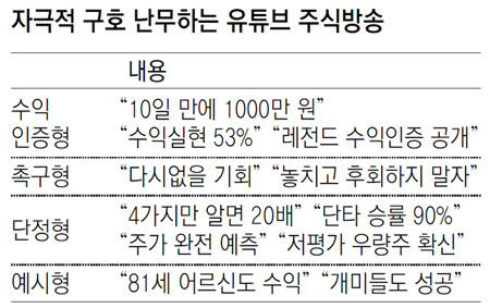 지난해 재테크 목적으로 주식투자를 공부하던 직장인 장모 씨(30)의 휴대전화 위로 솔깃한 문구가 떠올랐다. 생생한 투자 경험담을 듣고자 유튜브 주식방송을 검색하던 무렵이었다. 영상 속 문구만 보면 왠지 금세 주식 대박의 꿈을 이룰 수 있을 것도 같았다.