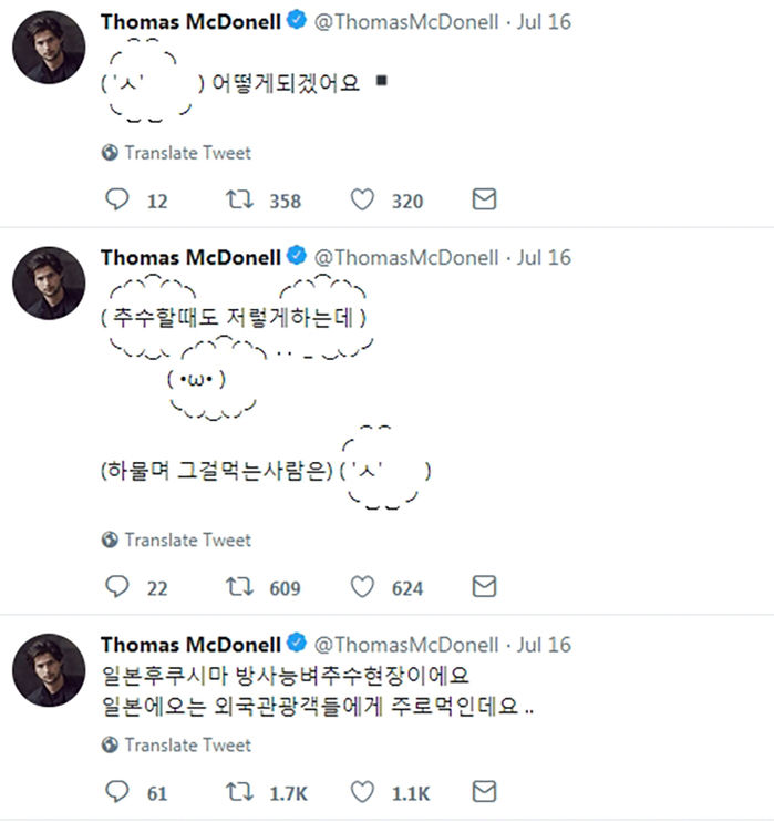 지난 16일 토마스 맥도넬은 자신의 트위터에 일본 후쿠시마 쌀의 안전성을 우려하는 내용의 글을 한글로 올렸습니다.