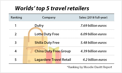 Lotte Duty Free, another Korean name, ranked No. 2 in the world for the third year in a row with sales of 6.09 billion euros. It was able to narrow its sales gap with industry powerhouse Dufry, which has been defending its leadership since 2014, to 1.5 billion euros from previous 2.3 billion euros. Switzerland-based Dufry recorded 7.7 billion euros in sales for full 2018.