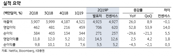 넷플릭스는 3분기 가이던스로는 매출액 52억5000만달러, EPS 1.04달러를 제시했다. 3분기 가입자 순증은 미국 700만명, 국제 620만명을 제시했다. 조 연구원은 “2분기 부진했던 가입자 증가세는 3분기에 만회할 것”이라며 “7월에 반영을 시작한 ‘기묘한 이야기(Stranger Things) 시즌3’를 필두로 자체 제작 콘텐츠 흥행으로 가입자 유입 증가 효과가 나타날 것”으로 전망했다.