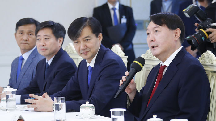 조국 민정수석과 윤석열 신임 검찰총장이 25일 오전 청와대에서 열린 임명장 수여식에 앞서 열린 차담회에서 대화하고 있다.