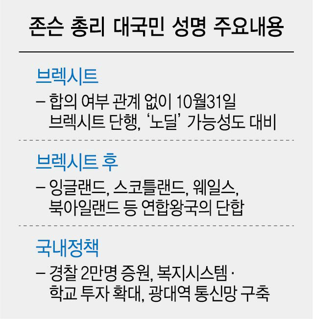 보리스 존슨 신임 영국 총리가 24일(현지시간) 취임 이후 첫 대국민성명에서 유럽연합(EU)과의 합의 여부와 관계없이 오는 10월31일 예정대로 브렉시트(영국의 EU 탈퇴, Brexit)를 단행하겠다고 공언했다. 이를 위해 존슨 총리는 전임 테리사 메이 내각의 각료 중 절반 이상을 물갈이하고 ‘브렉시트 강경파’를 전진 배치했다.