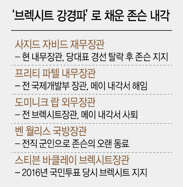 영국 안팎에서 고조되는 우려를 억누르기라도 하듯 존슨 총리는 브렉시트 단행이라는 과제를 달성하기 위해 이날 내각 전면에 강경파를 배치했다. 내각의 ‘넘버 2’인 재무장관에는 사지드 자비드 내무장관이 기용됐다. 자비드는 당초 집권 보수당 대표 경선에 참여했다가 탈락한 뒤 존슨 총리 지지를 선언한 인물로서 브렉시트 지지자로 분류된다. 외무장관에는 브렉시트 강경론자인 도미닉 라브 전 브렉시트장관이 기용됐다. 그는 메이 내각에서 브렉시트 협상을 책임지다 메이 총리의 ‘소프트 브렉시트’ 계획에 반발해 사임했다. 내무장관으로 발탁된 아시아계 여성인 프리티 파텔 전 국제개발장관 역시 대표적인 브렉시트 강경론자다.