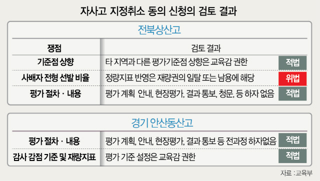 다만 교육부는 전북교육청이 다른 교육청보다 10점 높은 80점을 기준점수로 부여한 점에 대해서는 “타 지역과 다른 평가기준점 상향은 교육감의 권한”이라며 위법성이 없다고 판단했다. 다른 시도교육청들도 전북도처럼 교육부 권고안보다 기준점을 대폭 올릴 수 있다는 우려에 대해서도 박 차관은 “법무법인에서도 의견이 엇갈렸지만 무한정으로 높인 일탈이 아니라 사회적으로 인용 가능하다면 받아들여야 할 것”이라며 적법성이 동의·부동의를 가를 핵심요인임을 설명했다. 교육부는 경기 안산동산고의 감사 감점기준 및 재량지표에 관해서도 “위법사항이 없었고 평가기준은 교육감의 권한”이라며 지정취소에 동의했다.