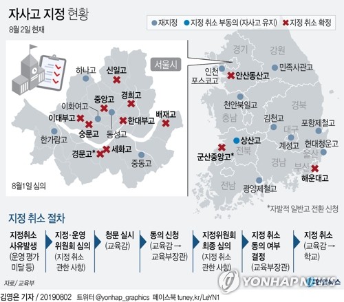(서울·세종=연합뉴스) 황희경 이효석 기자 = 서울 9개 고교와 부산 해운대고 등 10개 학교가 내년부터 자율형사립고(자사고) 지위를 잃고 일반고로 전환된다.