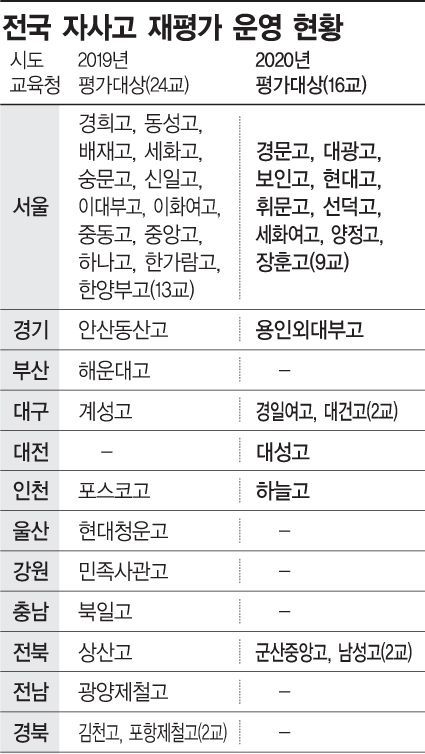 올해 자사고 운영성과평가(재지정평가) 결과, 서울에서는 경희고와 배재고·세화고·숭문고·신일고·중앙고·이대부고·한대부고가, 경기도와 부산에서는 각각 안산동산고과 해운대고가 일반고로의 전환이 확정됐다.