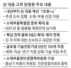 당정청이 정한 7가지 대책의 핵심은 내년도 본예산에 1조원 이상 규모로 일본 수출규제 대응 예산을 반영하고 소재·부품 기업에 대한 각종 예산·세제 지원을 강화한다는 것이다. 그동안 우리가 다소 취약했던 핵심 반도체를 포함한 기계·화학 등의 기술 자립과 경쟁력 강화 방안에 대해 중장기 대책을 만들어나가는 것이 가장 시급한 과제로 지목됐기 때문이다. 이날 고위 당정청 논의에 따라 정부의 소재·부품·장비 종합 대책은 5일 추가로 발표된다. 조정식 더불어민주당 정책위의장은 4일 브리핑에서 "우리 부품·소재 산업에 있어서 10년, 20년 전에도 문제 제기가 됐는데 또다시 이런 문제가 닥쳐 근본적인 틀을 짜야 한다는 데 공감대를 이뤘다"고 설명했다.