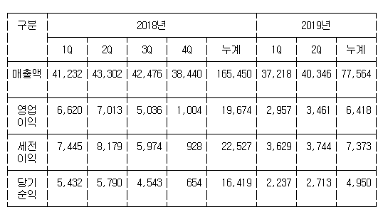 같은 기간 매출액은 4조346억원으로 6.8% 줄었고 당기순이익은 2천713억원으로 53.1% 감소했다.