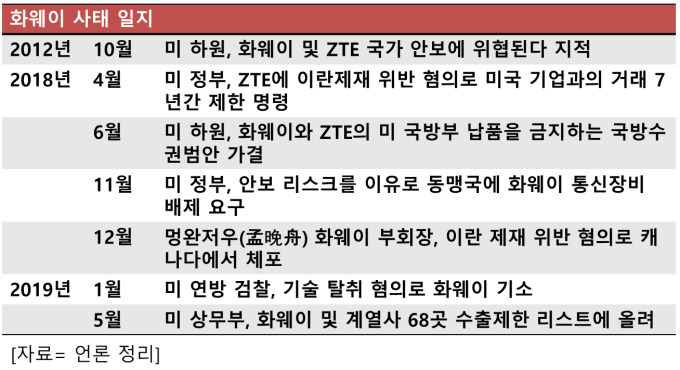 5월 20일 미국 기업의 피해 최소화를 위해 미 상무부는 화웨이에 내린 ‘수출제한 리스트(Entry List)’ 시행을 90일 유예했다. 국가안보에 영향을 주지 않는 제품에 대해 예외적으로 화웨이와의 거래가 허용된 상태다. 유예 조치는 8월 19일까지 유지된다. 미 당국의 유예조치 연장 혹은 제재 해제가 이뤄지지 않으면 통신 및 스마트폰 반도체 조달 및 차기 칩셋 개발에 지장이 생길 것으로 전망된다.