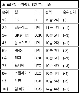ESPN은 7일 오전(이하 한국시간) 2019시즌 서머 스플릿 일곱 번째 리그 오브 레전드(이하 LOL) e스포츠 프로팀 파워랭킹을 공개했다. ‘LOL 유로피안 챔피언십(이하 LEC)’의 호랑이 G2가 4주 연속 1위를 지킨 가운데 지난 8주차에서 ‘9연승 질주’와 함께 ‘LOL 챔피언스 코리아(이하 LCK)’ 1위에 등극했던 SK텔레콤이 파워랭킹에서도 3계단 상승한 3위에 올라섰다.