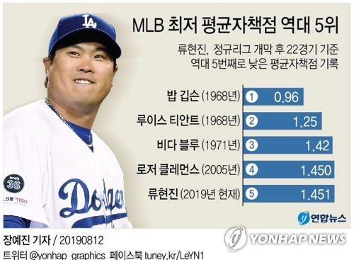 밥 깁슨(1968년·0.96), 루이스 티안트(1968년·1.25), 비다 블루(1971년·1.42), 로저 클레먼스(2005년·1.450)만이 류현진(1.451) 이름 위에 자리했다.
