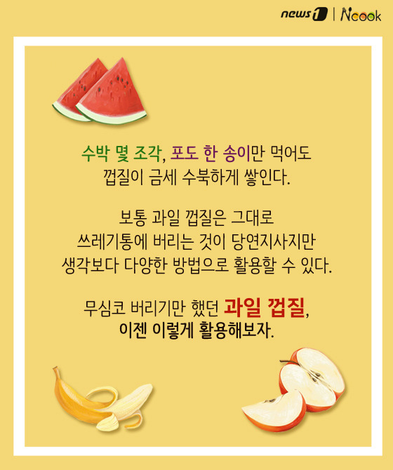 (서울=뉴스1) 박라경 에디터 = 수박 몇 조각, 포도 한 송이만 먹어도 껍질이 금세 수북하게 쌓인다. 보통 과일 껍질은 그대로 쓰레기통에 버리는 것이 당연지사지만 생각보다 다양한 방법으로 활용할 수 있다. 무심코 버리기만 했던 과일 껍질, 이젠 이렇게 활용해보자.