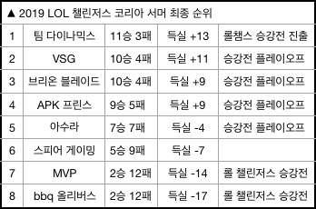 한편 아수라가 APK에게 2-0 승리를 거두면서 2019 롤 챌린저스 서머 스플릿의 최종 순위는 재경기 없이 확정됐다. 1위 팀 다이나믹스는 ‘LOL 챔피언스 코리아(롤챔스)’ 승격강등전에 직행했다. 승강전 플레이오프의 대진은 ‘2위 VSG-5위 아수라’ ‘3위 브리온-4위 APK’로 정해졌다.