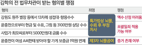 김 전 차관 측은 포괄일죄는 물론 뇌물죄도 성립하지 않는다는 입장이다. 윤씨 등이 단지 친분으로 현직 검사였던 김 전 차관에게 향응 등을 제공한 것일 뿐이라는 이유에서다. 또 뇌물죄가 성립하려면 ‘직무연관성’과 ‘대가성’이 있어야 하는데, 그조차 없었다는 게 김 전 차관 측 주장이다. 아울러 김 전 차관 측은 검찰 측 증거가 부실하다며 그 밖의 혐의도 인정할 수 없다고 했다. 이 같은 쟁점을 두고 법조계 의견은 분분하다. 한 판사 출신 변호사는 “(김 전 차관이) 성접대를 받았다는 사실이 인정만 되면 충분히 뇌물이라고 볼 수 있겠지만, 액수 산정은 어려운 측면이 있어서 특가법으로 보기 어렵다면 그냥 형법상 뇌물수수로 봐야 할 것”이라고 말했다. 반면 법무법인 더쌤 김광삼 대표변호사는 “포괄일죄 여부에 따라 공소시효 완성 여부도 달라지기 때문에 일부라도 무죄가 되거나 전체 금액에서 1억원이 미달한다면 처벌할 수 없는 경우가 생길 수 있다”고 했다.