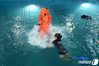 지난 13일 잠수함 비상탈출훈련장에서 탈출복을 입은 잠수함승조원이 수심 10m 아래에 있는 가상의 잠수함 해치를 열고 탈출, 수면 위로 떠오르고 있다. (잠수함사령부 제공) 2019.8.14/뉴스1