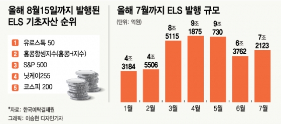 16일 한국예탁결제원에 따르면 특정 종목의 가격이나 주가지수와 연계해 투자수익이 결정되는 ELS의 기초자산 비중은 유로스톡50이 가장 높은 것으로 나타났다. 홍콩항셍지수(홍콩H지수), S&P500, 닛케이255, 코스피200이 뒤를 이었다. 월별 ELS 발행 규모는 지난달 7조2123억원 상당으로 올해 들어 지난 5월까지 점진적으로 상승했다가 규모가 줄어드는 모습이다.