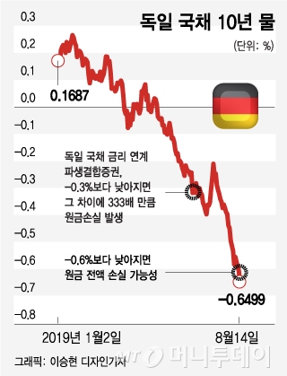 이 상품은 독일 국채금리가 -0.2% 이상이면 4~5% 수익을 기대할 수 있지만, 그 밑으로 떨어지면 원금 손실이 100%도 날 수 있다. 국채금리가 -0.3% 밑으로 가면 -0.2%와의 차이에 333배 곱한 만큼 손실을 보는 것이다. -0.6%로 떨어지면 원금의 80% 손실이 나고 -0.7%까지 내려가면 원금 전액을 잃는다. 독일 국채 10년물 금리는 이미 -0.6% 이하로 떨어져 100% 원금손실 가능성이 높아졌다.
