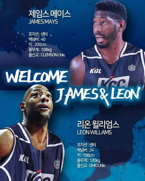 프로농구 전주 KCC가 2019-2020시즌 외국인 선수로 제임스 메이스(33·199.9㎝)와 리온 윌리엄스(33·196.6㎝)를 영입했습니다.
