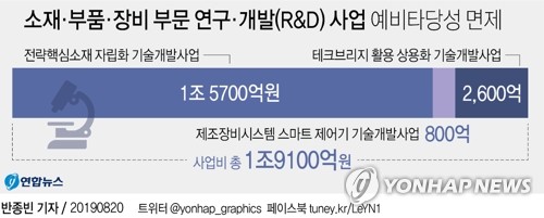 (서울=연합뉴스) 이유미 기자 = 일본의 수출규제 조치에 대한 대응책의 일환으로 정부가 소재·부품·장비의 일부 연구·개발(R&D) 사업에 대해 예비타당성조사(예타)를 면제해줄 전망이다.