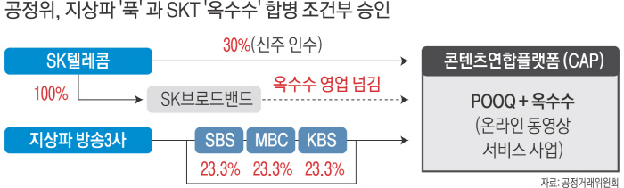 공정거래위원회는 옥수수와 푹의 기업결합을 조건부로 승인했다고 20일 밝혔다. 지난 4월 SK텔레콤은 지상파 3사의 합작법인 콘텐츠연합플랫폼(CAP) 주식 30%를 취득하고, CAP가 SK텔레콤이 지분 100%를 갖고 있는 SK브로드밴드의 OTT 옥수수를 넘겨받는 내용의 기업결합을 공정위에 신고한 바 있다.