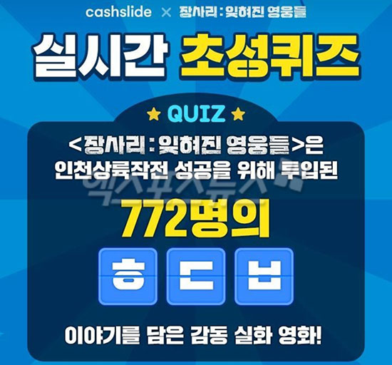 캐시슬라이드는 21일 "'장사리 : 잊혀진 영웅들'은 인천상륙작전 성공을 위해 투입된 772명의 ㅎㄷㅂ"에서 초성 부분을 묻는 퀴즈를 출제했다.