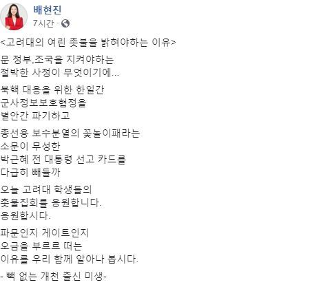 이후 배 위원장은 ‘고려대의 여린 촛불을 밝혀야 하는 이유’라는 제목의 글에서 “문 정부, 조국을 지켜야 하는 절박한 사정이 무엇이기에…”라고 지소미아 파기 배경에 의문을 드러냈다.