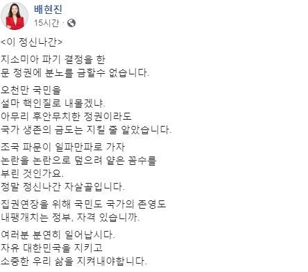 배현진(사진) 자유한국당 송파을 당협위원장이 한국 정부가 한일군사정보보호협정(GSOMIA·지소미아) 파기 결정에 강하게 분노했다.
