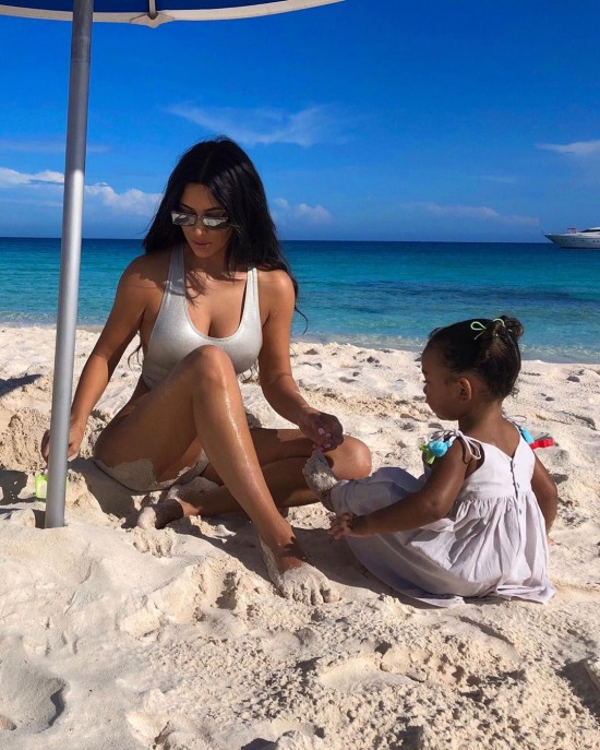 공개된 사진 속 킴 카다시안은 딸과 함께 바하마로 여행을 떠난 모습. 킴 카다시안은 은색의 수영복을 입고 아기를 품에 안은 채 섹시한 보디라인을 자랑해 시선을 사로잡았다.