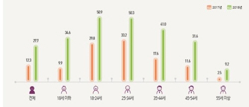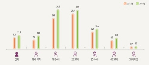 세부적으로 25∼34세가 32.9%로 뒤를 이었고 35∼44세(16.6%), 18세 이하(10.9%), 45∼54세(8.8%), 55세 이상(1.2%) 등 순이다. 전체 연령층이 평균적으로 디지털 콘텐츠 유료서비스를 이용하는 비율은 11.3%로 전년의 9.2%보다 2.1%포인트 상승했다.