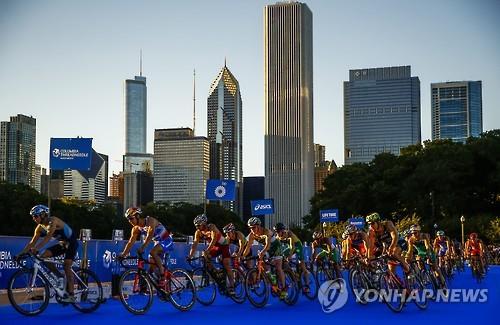 (시카고=연합뉴스) 김 현 통신원 = 북미 오대호 중 하나인 미시간호수를 무대로 펼쳐지는 세계 최대 규모 철인 3종 경기 '시카고 트라이애슬론'(Chicago Triathlon) 2019 대회가 수영 부문을 제외하고 '듀애슬론'(Duathlon)으로 치러졌다.