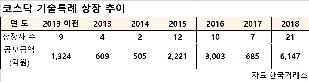 기술특례상장은 사업성 대신 기술의 잠재성을 보고 주식시장에 상장 허가를 내어주는 방식이다. 지난 2005년 도입됐지만, 2015년 박근혜 정부 들어 기술특례 상장 활성화에 드라이브를 걸었다. 2015년 12곳(강스템바이오, 앤케이맥스(구 에이티젠), 제노퍼커스, 코아스팸, 펩트론, 아이진 등) 이후 급격하게 사례가 늘었다. 지난해에는 21곳의 기업이 기술특례로 상장했는데, 18곳이 바이오 업체였다.
