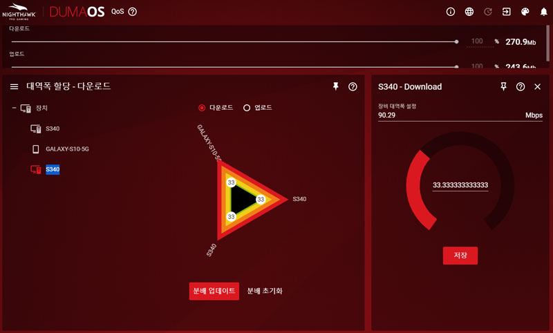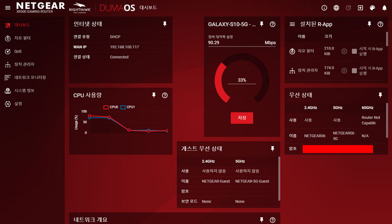 넷기어 나이트호크 XR300의 초기 설치를 마치고 PC용 웹브라우저를 통해 내부 메뉴로 접속해 보면 상당히 화려한 인터페이스의 설정 메뉴를 만날 수 있다. 넷기어에서는 이를 단순한 설정 메뉴가 아닌 ‘DUMA OS’라는 이름의 게이밍 공유기 전용 운영체제라고 강조하고 있다. 참고로 나이트호크 XR300는 PC가 아닌 전용 모바일 앱인 ‘나이트호크(NightHawk)’로 접속해 내부 기능을 설정하는 것도 가능하다. 하지만 DUMA OS가 좀 더 본격적인 고급 기능을 다수 제공하므로 제품의 기능을 온전히 이용하려면 PC를 이용한 기능 설정을 좀더 추천한다.![]() |
