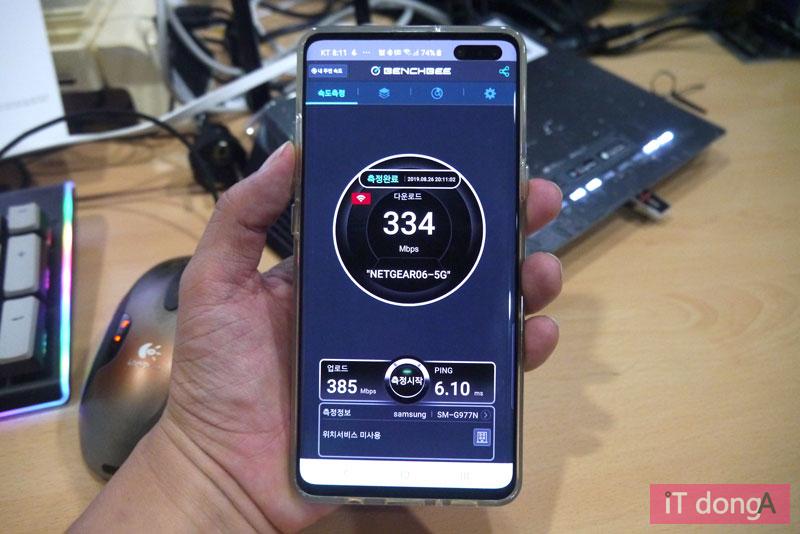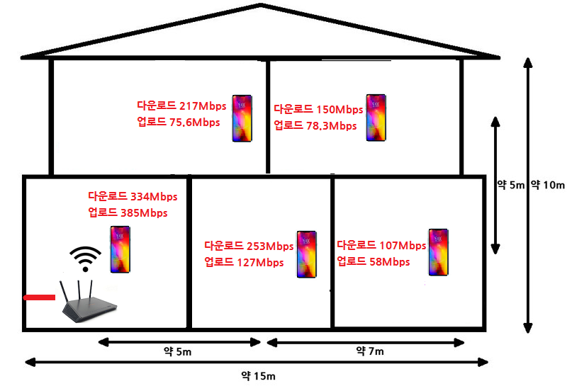 공유기 바로 옆의 스마트폰(삼성전자 갤럭시 S10 5G)에서는 다운로드 334Mbps / 업로드 385Mbps로 유선 못지 않은 와이파이 속도를 냈다. 그리고 합판 재질의 벽 1개 정도를 지나 약 5미터 정도 떨어진 곳에서도 다운로드 253Mbps / 업로드 127Mbps의 빠른 속도로 통신이 가능했으며, 합판 벽 2개를 지나 약 12미터 정도 떨어진 방에서도 다운로드 107Mbps / 업로드 58Mbps로 비교적 원활한 접속이 가능했다.