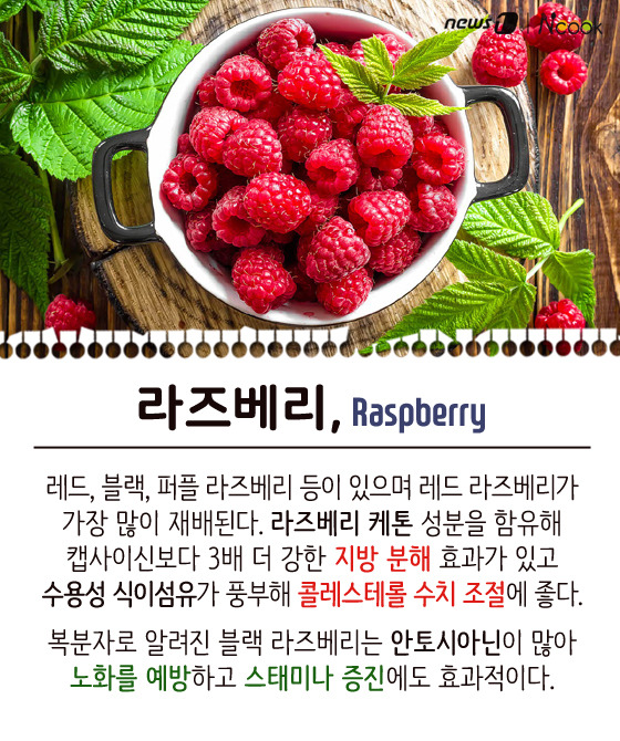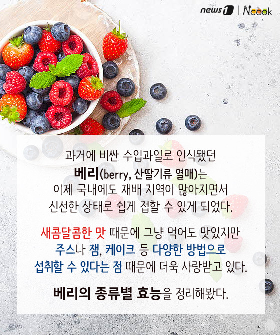 (서울=뉴스1) 박라경 에디터 = 과거에 비싼 수입과일로 인식됐던 베리(berry, 산딸기류 열매)는 이제 국내에도 재배 지역이 많아지면서 신선한 상태로 쉽게 접할 수 있게 되었다. 새콤달콤한 맛 때문에 그냥 먹어도 맛있지만 주스나 잼, 케이크 등 다양한 방법으로 섭취할 수 있다는 점 때문에 더욱 사랑받고 있다. 베리의 종류별 효능을 정리해봤다.