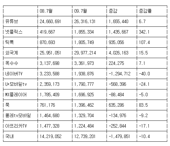 유튜브·틱톡 등 3개 외국OTT 7월 순이용자 3천만명 육박…7개 국내 OTT의 2.4배