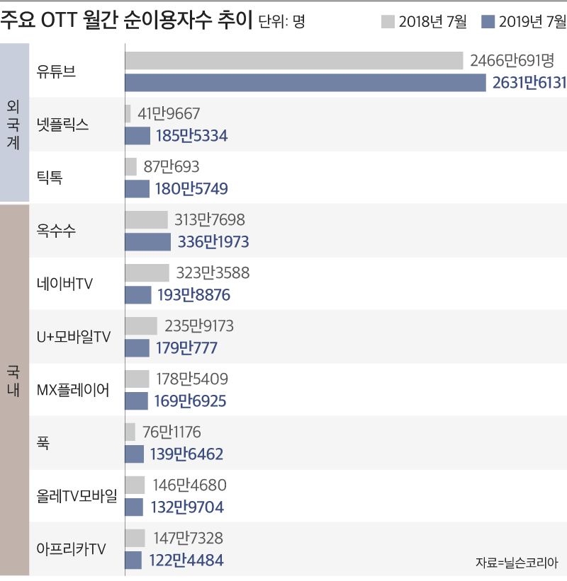 반면 옥수수와 네이버TV, U+모바일tv, MX플레이어, 푹, 올레tv모바일, 아프리카TV 등 국내 7개 OTT의 이용자는 총 1274만명으로 1년전보다 10.4%(148만명) 감소했다.