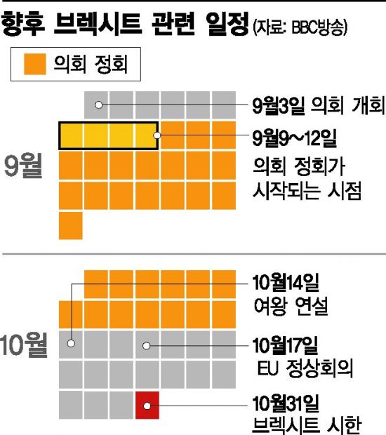 통상 영국 여왕은 하원 회기가 시작될 때마다 의회에서 정부의 주요 입법 계획을 발표하는 연설에 나선다. 이에 따라 9월9~12일께부터 연설 전날까지 영국 하원은 정회하게 된다. 하원이 여름휴가를 마치고 다음 달 3일 개회하는 점을 감안할 때 의회가 열린 지 불과 일주일여 만에 사실상 폐쇄되는 이례적 일정인 셈이다.