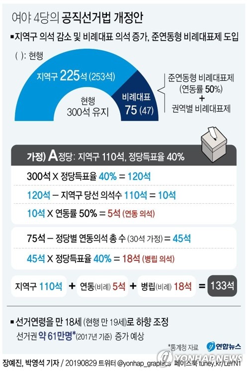 비례대표 의석수는 국회의원 선거에서의 전국 정당 득표율을 기준으로 연동률 50%를 적용해 배분한 뒤 남은 의석은 지금 제도처럼 정당 득표율에 비례해 나누는 내용이 담겼다.