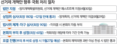 국회 정치개혁특별위원회가 29일 공직선거법 개정안을 의결해 법제사법위원회에 넘기면서 선거제 개편안이 지난 4월 패스트트랙 지정 후 첫 관문을 넘었다. 당장 여야 4당이 자유한국당을 제외하고 법안을 처리하면서 한국당의 반발로 정개특위 이후 인사청문회를 제외한 국회 상임위 등이 줄줄이 취소되는 등 정국 경색의 방아쇠가 당겨졌다는 평가다. 법제사법위원회 심의를 거쳐 법안이 본회의에 상정돼도 최종 통과를 장담할 수는 없다는 관측도 나온다. 비례제 확대의 특성상 거대 양당에 불리해 더불어민주당과 일부 정당 내부에서 이탈표가 나올 가능성도 있어서다.