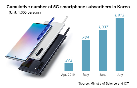 The number of 5G users in South Korea came to 1,911,705 as of the end of July, adding 574,840 from a month ago, according to the data released by the Ministry of Science and ICT. The figure rose from 271,686 subscribers in maiden month of April to 512,529 in May and to 552,650 in June.