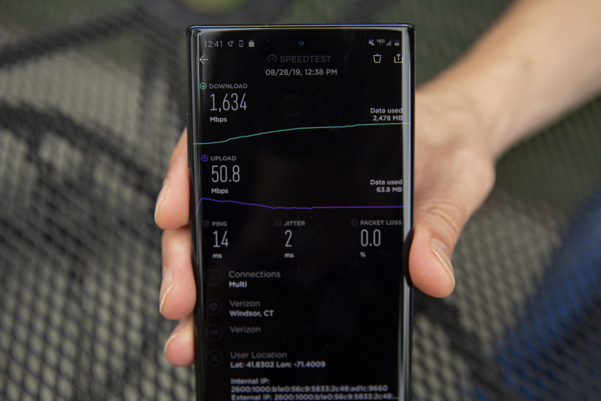 테스트에서 노트10+ 5G츼 최고 속도는 1.6Gbps 이상이었고, 2시간짜리 영화를 10초 만에 다운로드했다. LTE를 능가했다는 말로는 부족하다. 다운로드 테스트에서 5G로 받은 파일의 재생 준비가 되도록 LTE로는 다운로드조차 시작하지 못했기 때문이다. 다시 말해 엄청나다. 그리고 이것은 잘 갖춰진 실험실에서의 테스트가 아니었다. 공공 네트워크를 사용하며 거리를 걸어 다니면서 테스트했다.