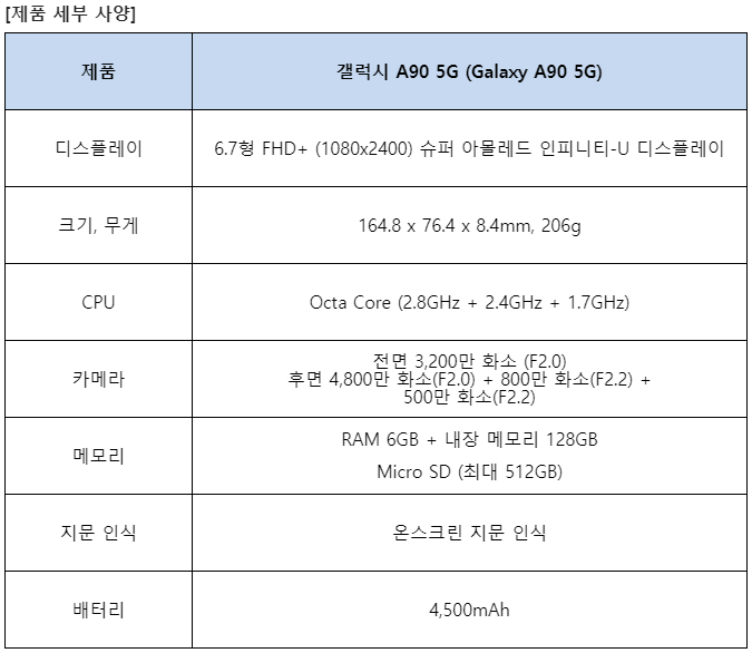 원문 요약: 삼성전자가 갤럭시 A 시리즈 최초로 5G 이동통신을 지원하는 '갤럭시 A90 5G'를 4일 국내에 출시한다고 전했다. 본 제품은 6.7 인치 슈퍼 아몰레드 인피니티-U 디스플레이와 체크 패턴 디자인을 도입했으며 트리플 카메라, 고성능 프로세서, 5G 기능 등을 갖췄다. 그 외에 삼성페이, 온 스크린 지문 인식, 고속 충전 등을 제공해 편의성을 높였다. 화이트 및 블랙 2가지 색상으로 출시하며 가격은 89만 9,800원이다.