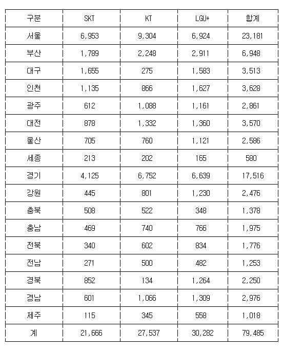 전국적으로 보면 대부분 지역에서 LG유플러스 기지국이 가장 많았다. KT는 서울과 충북, 전남에서 가장 많았고 SK텔레콤은 대구와 세종에서 1위였다.
