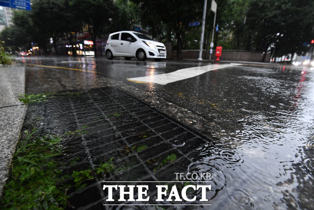 13호 태풍 링링이 우리나라로 북상하고 있는 5일 경기도 성남시 분당구 불정로 일대 하수도가 빗물에 잠겨있다./분당=남윤호 기자