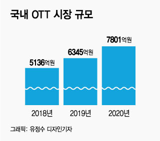 한편 국내 OTT 시장 규모는 지난해 5136억원에서 올해 6345억원, 내년 7801억원으로 증가하는 등 매년 20%가 넘는 성장률을 기록할 것으로 전망된다.