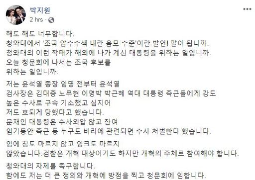 이 같은 소식이 전해지면서도 박 의원은 이날 오전 자신의 페이스북에 올린 글(위 사진)을 통해 "해도 해도 너무하다"고 지적했다. 아무리 조 후보자에 대한 검찰 수사가 과하다고 인식했더라도 '내란음모수사' 등의 발언은 과도한 비난이라는 주장이다. 그는 구체적으로, "윤석열 검찰총장은 김대중·노무현·이명박·박근혜 등 역대 대통령 측근들을 강도 높은 수사로 구속 기소했고, 심지어 저도 호되게 당했다고, 제가 윤 총장 임명 전부터 말한 바 있다"면서 "검찰은 개혁의 대상이기도 하지만 개혁의 주체로도 참여해야 한다"고 비판했다. 이어, "청와대의 자제를 촉구한다"며 "저는 더 큰 정의와 개혁에 방점을 찍고 청문회에 임한다"고 덧붙였다.